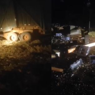 Engavetamento na BR-163 após carreta sem freio deixa três feridos