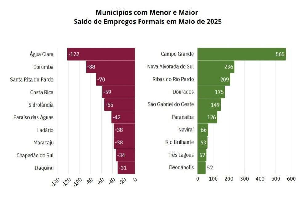 Na distribuição regional, os municípios com maiores saldos positivos de empregos formais foram Campo Grande (565), Nova Alvorada do Sul (236), Ribas do Rio Pardo (209), Dourados (175) e São Gabriel do Oeste (149).