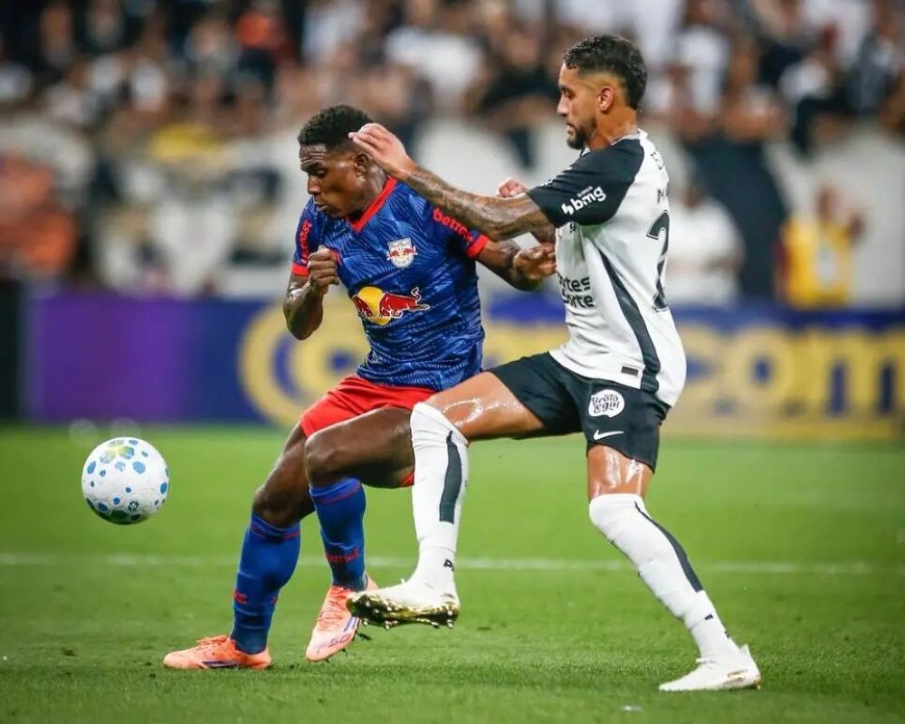 A primeira chegada perigosa da partida foi do Bragantino. Aos sete minutos, Pitta ganhou dividida na área e rolou para Gabriel, que chegou chutando e parou em defesa de Hugo Souza. O goleiro do Corinthians precisou trabalhar novamente aos 11, em uma bomba de Lucas Barbosa de fora da área.