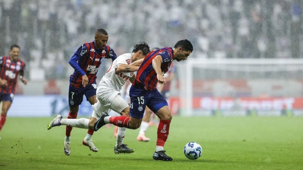 Sob forte chuva em Salvador, o Inter começou o jogo melhor, indo para o ataque, mas as finalizações mais perigosas ficaram com o Bahia, que já igualou o nível antes da metade do primeiro tempo.