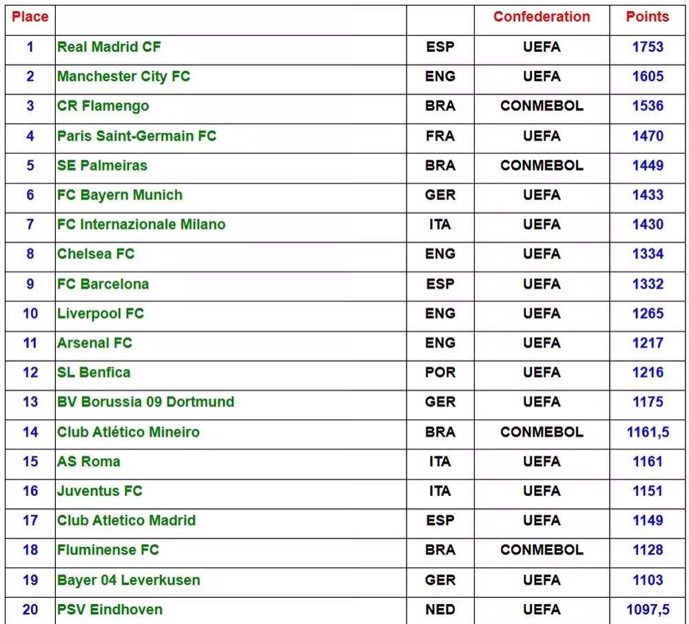 O Real Madrid (Espanha) lidera a lista, seguido pelo Manchester City (Inglaterra). Atuais campeões do Intercontinental e da Copa do Mundo de Clubes, respectivamente, o PSG (França) é o quarto, e o Chelsea (Inglaterra), o oitavo.