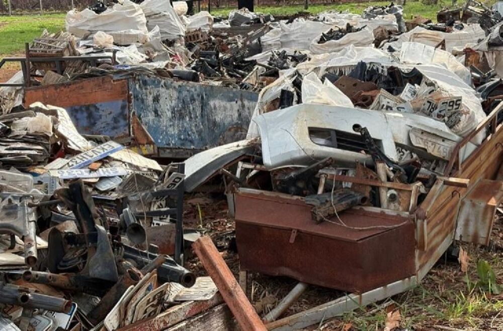 O volume massivo do lote é composto por restos de veículos, incluindo peças essenciais para a identificação, como blocos de motores, placas e chassis. Além disso, o lote contém um semi-reboque.