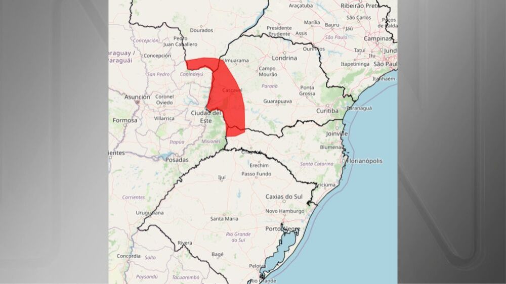 Há possibilidade também de queda de granizo. As regiões em alerta incluem o Noroeste Paranaense, o Sudoeste Paranaense, o Oeste Paranaense, Oeste Catarinense, Centro-Sul Paranaense e o Sudoeste de Mato Grosso do Sul.