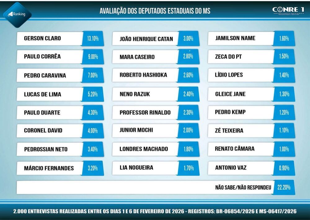 Nesse contexto, o posicionamento de Caravina entre os três parlamentares mais bem avaliados reforça o reconhecimento popular de sua atuação, compromisso e presença constante junto aos municípios e à sociedade sul-mato-grossense.