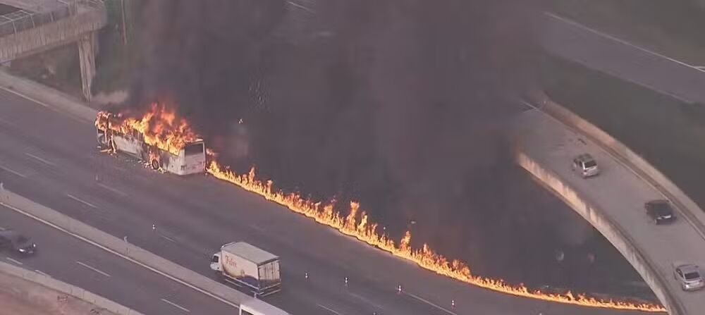 O veículo incendiado ocupa a faixa da direita da rodovia e deixou uma cortina de fogo pela rodovia, dando a impressão de que houve um vazamento de combustível.